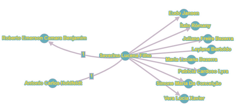 No grafo acima, observamos que o pesquisador Severino Lucena Filho tem dois ascendentes, que o orientaram em seu mestrado e doutorado, ambos sobre o folkmarketing, e possui 8 (oito) descendentes diretos, todos orientados em nível de mestrado. Como seus descendentes ainda não produziram relação de orientação para mestrado e doutorado, podemos dizer que o folkmarketing ainda se encontra na sua primeira geração, mesmo tendo diversos trabalhos sendo defendidos em nível de graduação pelo Brasil.