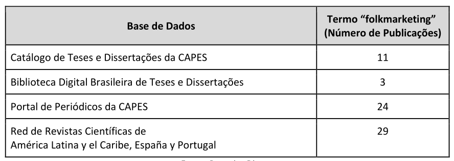 Para representar esta breve análise, utilizamos como base o termo folkmarketing e realizamos o levantamento de dados nas plataformas online do Catálogo de Teses e Dissertações da CAPES, na Biblioteca Digital Brasileira de Teses e Dissertações (BDTD), no Portal de Periódicos da CAPES e na Red de Revistas Científicas de América Latina y el Caribe, España y Portugal (Redalyc), escolhidas devido sua importância para o meio acadêmico. Como estamos buscando dados de todo o período histórico da teoria, não foi feito uso do filtro tempo para captação das informações.