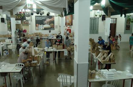 De acordo com Benazzi (2015), no local da produção dos alimentos, entorno da paróquia, encontram-se quatro cozinhas de formato industrial onde se prepara toda comida da festa. As normas higiênico-sanitárias – de segurança dos alimentos são realizadas desde a escolha da matéria prima, higienização, confecção dos produtos, fracionamento em embalagens seguras, e com a distribuição em delivery – conforme protocolo e mostras imagens abaixo.