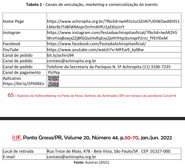 Abstract: The Italian festival Our Lady of Achiropita, a historical-cultural, religious and gastronomic event celebrated annually in the neighborhood of Bixiga (São Paulo-SP), is a voluntary action to raise funds for the support of people in social vulnerability. The study aims to identify communication strategies used by the Special Edition - 94th of the festival in 2020 in the face of the health crisis caused by Covid-19. This is theoretical research, an integrative bibliographic review in which were used websites, social networks, and printed documents about the phenomenon studied. The results show that in overcoming social isolation, e-commerce contributed to the implementation of the event. It is considered, therefore, that the proposals of commercialization, above all from a folkcommunicational perspective, and mainly from folkmarketing, allowed the preservation of religious and culinary heritage with its multiple cultural and symbolic expressions that were incorporated into the reality of São Paulo from migratory movements, registered in communication networks and folkcommunication that recreated the gastronomic marks of the party.
