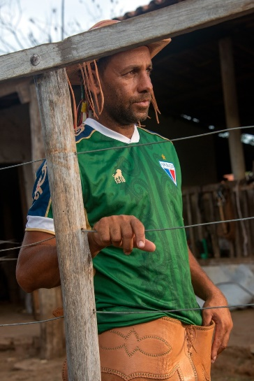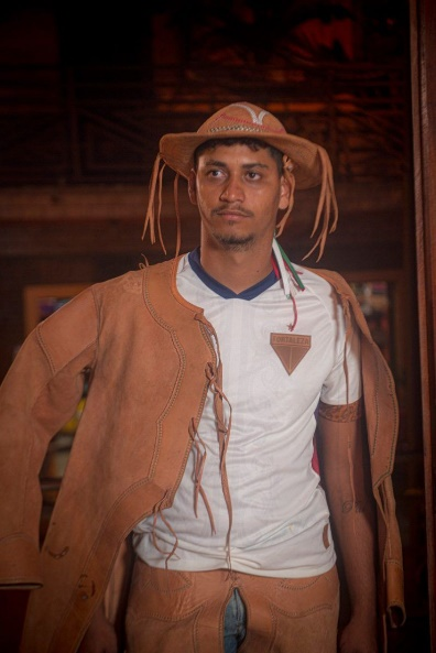 Em seguida, aparece Espedido Seleiro sendo apresentado como “tesouro da cultura”, trabalhando em seu ateliê (figura 6), falando sobre o amor e dedicação pela sua profissão. Na cena aparecem vários artefatos feitos em couro e seu testemunho sobre a sua paixão pelo Fortaleza E.C no formato de background14. Sua voz se mistura com o som da sanfona que toca uma canção da torcida do Fortaleza E.C em apoio ao time. O vídeo continua com imagens de um vaqueiro vestido com o uniforme do Fortaleza, seu chapéu de couro e gibão (figura 7). Na sequência, aparecem flashs desse vaqueiro montado a cavalo “correndo” no curral, cenas de crianças jogando bola, um casal em uma casa simples, feita de barro, usando o uniforme do Fortaleza E.C e, para finalizar, o artesão bate no peito, fala da exclusividade que o time tem com essa sua peça, ressaltando sua torcida, demostrando todo o amor pelo clube.