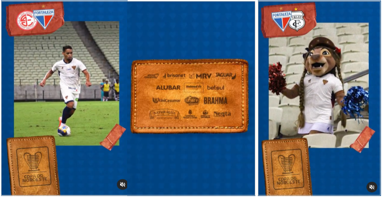 Nesse estudo, identificamos nas chamadas dos jogos do Fortaleza E.C em sua rede social Instagram a presença de artes gráficas com alusões ao couro, com referências e elementos típicos da região Nordeste. Na figura 9, temos duas publicações referentes a dois jogos do Fortaleza E.C.: a) Na partida disputada contra a equipe do 4 de julho do Piauí, aparece o selo da Copa do Nordeste e as marcas dos patrocinadores “cravadas em couro”, um jogador aparece vestido em campo com a camisa desenhada por Espedito Seleiro. b) Na postagem referente a partida contra o Treze da Paraíba, aparece a mascote com um chapéu de couro, usado pela turma de Lampião, comum nas obras de Espedito Seleiros. Já Stella, mascote do time, aparece vestida com o uniforme da Copa do Nordeste. São ações de Folkmarketing com o objetivo de promover uma identificação mais próxima entre torcedores e marca/time.
