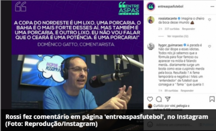 Vocês estão loucos, estão se baseando em duas rodadas. O Alê (Oliveira, comentarista) se baseia na Copa do Nordeste que é um lixo, é uma porcaria. Desculpa, mas é uma porcaria. O Bahia é o mais forte desses, talvez nem lute para cair, mas também não vai chegar na Libertadores. É uma porcaria também, outro lixo. Eu sou franco, eu falo o que é a verdade. Eu sou realista. Não vou falar que o Ceará é uma potência, é uma porcaria. (GATTO, 2021, on-line)
