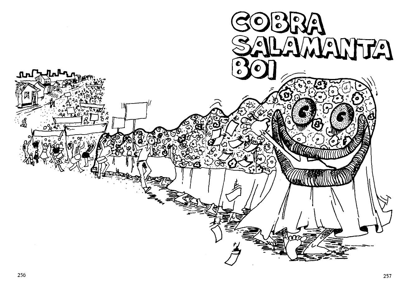 A “Cobra Salamanta Boi”12, por exemplo, derivada de manifestações carnavalescas nordestinas, é um tipo de Troça Carnavalesca que já foi bastante usada em mobilizações de bairros na periferia de São Paulo, ainda na época da ditadura militar (1964-1985), como forma de protesto e reivindicação. Ela reúne elementos da arte e culturas populares que lembram o carnaval, mas que é ressignificada para os fins de mobilização social. Como um tipo diferente de passeata desenvolvida por associações comunitárias para comunicarem-se com o poder público local, diante da percepção de sua inoperância frente as demandas dos loteamentos clandestinos e outros aglomerados urbanos na periferia de São Paulo. Uma vez enxertadas sob uma imensa “cobra” construída com tecidos vibrantes e ferragens que davam o formato de corpo e cabeça de cobra, além de dar-lhe movimento ao ser carregada pelas pessoas em ritmo de protesto, as vozes de denúncia e cobranças eram expressas em cartazes carregados simultaneamente nas laterais para dar mais visibilidade às demandas da periferia.