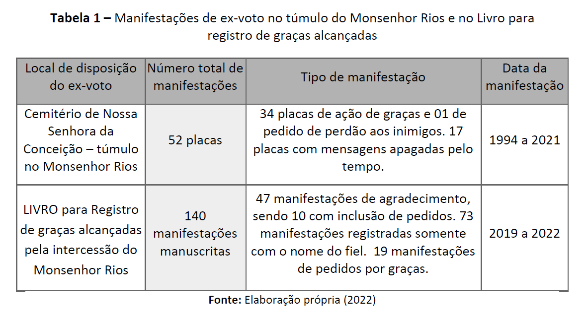 De acordo com a Tabela 1 observa-se um total de 192 manifestações de ex-voto, as quais foram verificadas entre os dias 10 e 12 de maio do ano de 2022. Das 52 placas dispostas no túmulo do Monsenhor Rios, algumas possivelmente foram datadas em ano anterior ao de 2019, pois 17 delas encontram-se apagadas em razão das ações do tempo. Observou-se que outras placas do mesmo material utilizado para a manifestação, a exemplo da pedra granito, datadas no ano de 1994 estão em perfeitas condições de identificação da mensagem. Apenas uma placa não fazia menção a agradecimento de graça alcançada e sim, um pedido de perdão aos inimigos daquele fiel. Em relação ao Livro para registro de graças alcançadas pela intercessão do Monsenhor Rios, observa-se que do total de 140 ex-votos, muitas manifestações de graças alcançadas são atribuídas diretamente à Deus ou a Jesus Cristo e uma, em específico a Eufrásia Teixeira Leite, uma benfeitora do município de Vassouras. Dessas manifestações de ação de graças, temos as que se incluem pedidos diversos, em sua maioria relacionados à saúde e um especificamente, de perdão. Muitos agradecimentos à sobrevivência pós-COVID-19, cura de doenças diversas, por conquista de casa própria e presença física na cidade de Vassouras. Outras manifestações estão implícitas na assinatura do fiel no livro.