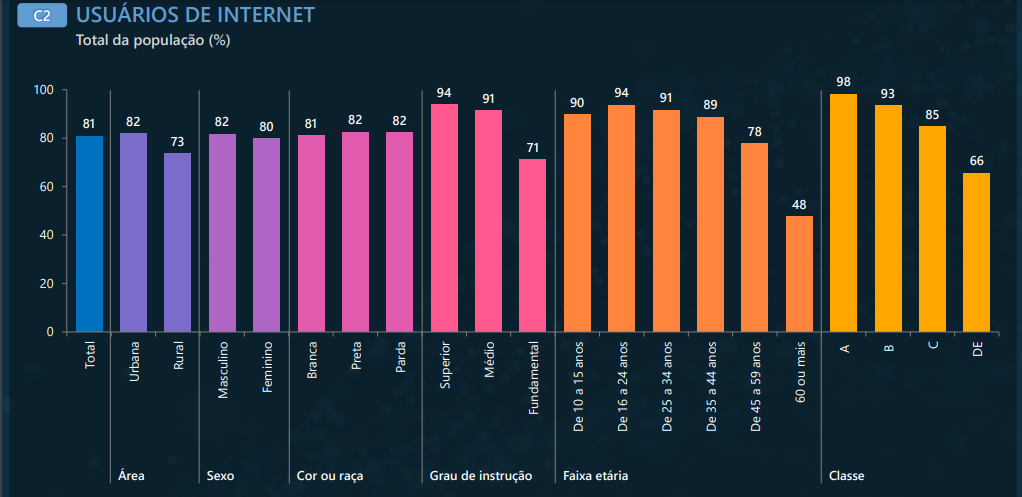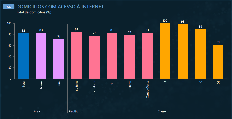 A versão mais recente da pesquisa, divulgada em junho de 2022, trouxe números atualizados e apontou crescimento no acesso: no estudo atualizado, são indicados 82% dos domicílios com acesso à internet, estratificados da seguinte maneira, por área, região e classe social: