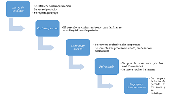 Por otra parte, el proceso de producción se basaría en 5 etapas, las mismas fueron diseñadas por el Ingeniero Rodolfo Rivera Hernández, Gerente de Producción de una empresa trasnacional (Rivera, comunicación personal, mayo 14, 2017). En la primera etapa se recibirá el pescado, se pesará y registrará el ingreso para efectos contables y de producción, se entregaría comprobante a cada pescador para efectuar el pago posterior. La segunda etapa se inicia al pasar el pescado al área de corte, donde se reduce el tamaño de los animales para facilitar su posterior manipulación en el proceso. Cocinar el pescado a altas temperaturas y secarlo constituye la tercera etapa. Al finalizar este proceso, se tendrá una especie de masa seca. El siguiente paso es realizar manualmente la pulverización de la masa, de esta forma se obtendrá la harina de pescado para consumo animal. En la última y quinta etapa se empaca el producto, se etiqueta el empaque y se completan los pedidos a distribuir. La Figura 1, muestra el resumen del proceso productivo.