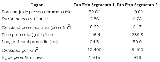 En el estudio realizado por Chacón (2016) para el Proyecto Humedales, entre los meses de marzo y abril de 2016, se puede determinar que existe una invasión avanzada de peces pleco en el río Frío, que alimenta el Humedal de Caño Negro. El Cuadro 1 muestra los principales resultados del estudio realizado. En los segmentos del río Frío, se evidencia una considerable proporción de plecos respecto a otras familias de peces nativas del lugar, incluso este porcentaje de captura es superior a varias de estas familias locales. En el trabajo del Proyecto Humedales realizado por Chacón (2016) se encontraron hembras grávidas, además de gran cantidad de galerías para anidación de estos peces, por lo que se confirma la reproducción en la zona.