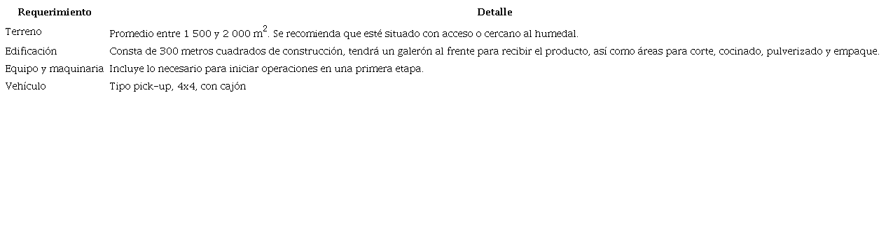 Para operar el proceso productivo descrito, se requiere un terreno, infraestructura, maquinaria y equipo, así como de un vehículo. El Cuadro 2, describe con mayor detalle los requerimientos necesarios para iniciar la producción artesanal de harina de pescado.