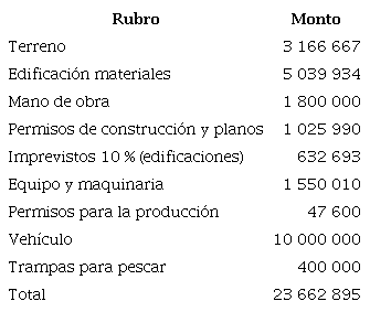 Estudio financiero: Para iniciar la producción de la harina del pez pleco para consumo animal se requieren los siguientes elementos: compra de terreno, construcción de instalaciones, contratación de la mano de obra para dicha construcción, costos de los permisos de construcción y elaboración de planos, compra de equipo, compra de vehículo, permisos para la producción, así como para la elaboración de trampas u otro método de pesca. El Cuadro 3 muestra el resumen de los costos aproximados.