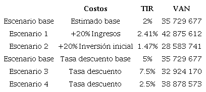 A los cálculos estimados se plantean 4 escenarios (Cuadro 4), el escenario 1 y 4 son positivos, dado que aumentan los ingresos esperados y reducen la tasa de descuento, respectivamente. En el primer escenario, se observa que con una modificación de un 20% en los ingresos en todo el periodo de análisis, la Taza Interna de Retorno (TIR) asume un valor de 2.4% y el Valor Actual Neto (VAN) de ¢42 875 612. En el cuarto, se reduce la tasa de descuento en un 50%, pasando de 5% a 2.5%, con estos supuestos, el VAN aumenta a ¢38 878 573. Por su parte, los escenarios 2 y 3, se consideran adversos para el proyecto. El escenario 2, se presenta un aumento de un 20% en la inversión, lo que ajusta a la baja la TIR, al disminuir a 1.47%, y la VAN merma en ¢7 145 935, con respecto a la estimación base. Por último, el escenario 3, presenta un aumento del 50% de la tasa de descuento, generando una disminución del 7.9% en el valor actual neto de los ingresos.