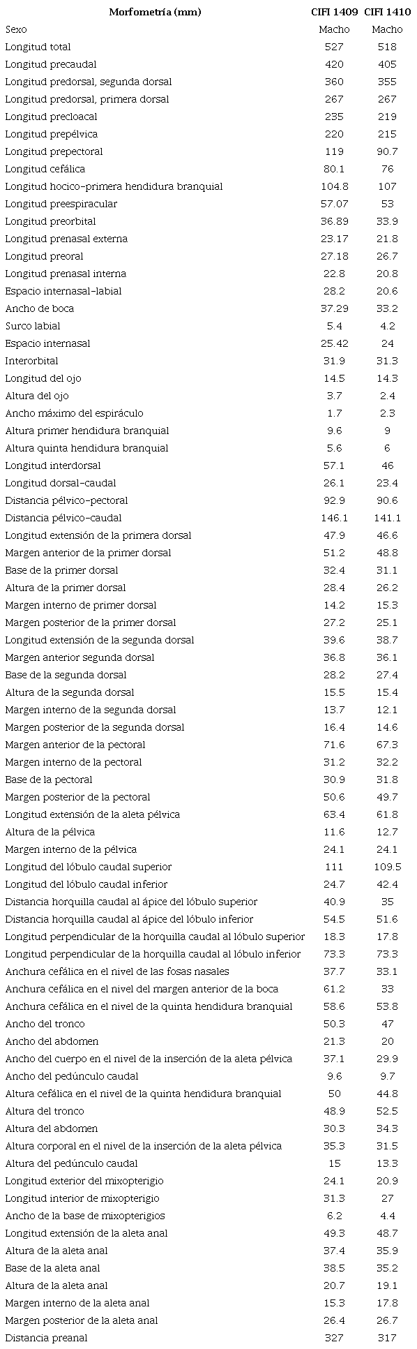 Los ejemplares fueron donados y depositados bajo los números de catálogo CIFI 1409 y CIFI 1410 en la Colección Ictiológica de la Facultad de Estudios Superiores Iztacala (CIFI), Universidad Nacional Autónoma de México. Se corroboró su identidad mediante las claves de Springer (1979) y Castro (2011). Se les determinó el sexo, así como la madurez mediante la calcificación del mixopterigio (Colonello et al. 2011). Se obtuvieron en total 75 medidas morfométricas de acuerdo con Compagno (2001).