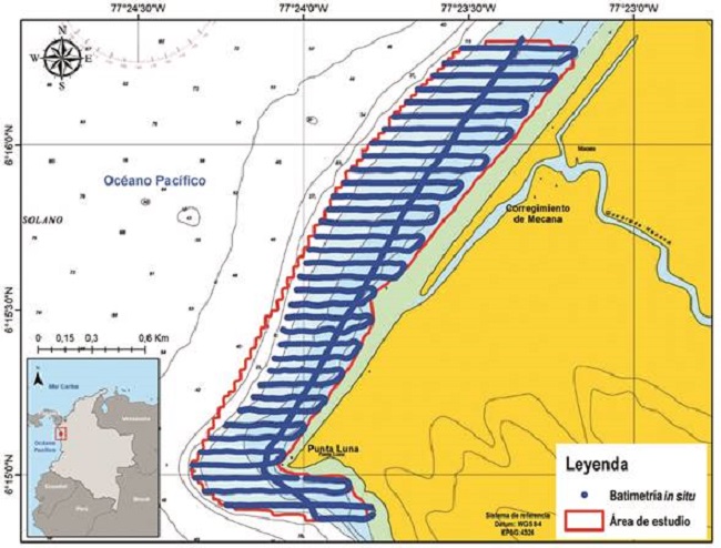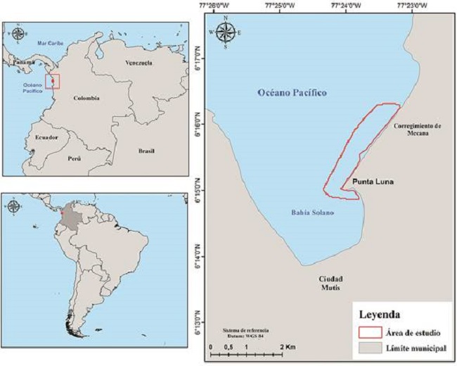 Se localiza al noreste del casco urbano de Ciudad Mutis sobre el litoral Pacífico colombiano del municipio de Bahía Solano, sector conocido localmente como “Punta Luna”, en las coordenadas geográficas 6° 16ʼ 18.93ʼʼ y 6° 14ʼ 51.724ʼʼ N y los 77° 24ʼ 20.26ʼʼ y 77° 23ʼ 10.968ʼʼ W (Fig. 1), posee un área aproximada de 1.72 km2 sobre el entorno marino. Esta zona se caracteriza por presentar diferentes paisajes que incluye planicies marinas, también, una alta dinámica mareal, precipitación promedio anual de 5 000 mm y una temperatura promedio anual de 26.3°C (Pierini & Rodríguez, 2014).