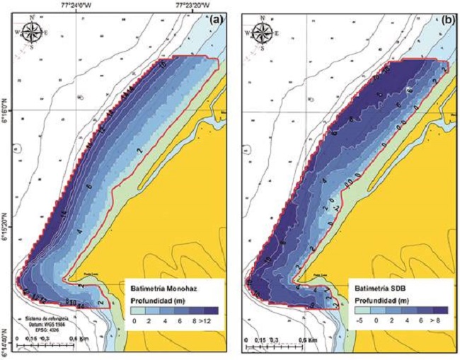 El principal objetivo de este estudio fue determinar la aplicabilidad de la SDB en aguas poco profundas en el sector conocido como “Punta Luna” en Bahía Solano, Colombia; este trabajo se presenta como un primer ejercicio en la zona y como una técnica complementaria que incorpora el procesamiento digital de imágenes de satélite, el manejo de datos batimétricos colectados in situ, la aplicación del modelo de Stumpf, la evaluación de la precisión en términos de ajuste del modelo SDB y la evaluación de la calidad de la SBD frente a estándares hidrográficos internacionales.