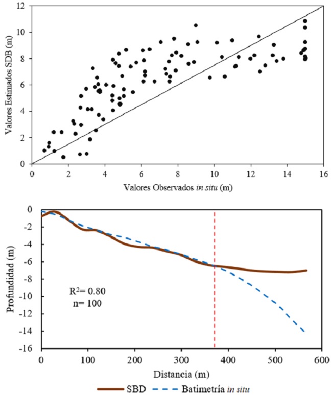 Se obtuvo la gráfica de cotejo de ambas medidas, se comparó las profundidades observadas vs. las estimadas desde el modelo SDB (Fig. 5); el perfil de profundidad alcanzó una R2 = 0.80, se observó que la SDB alcanza la mayor incertidumbre a los 7 m de profundidad.