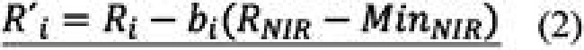 Adicionalmente, se realizó la corrección de la reflexión especular de la superficie del agua, según lo propuesto por (Hedley et al. 2005) (ecuación 2); en este proceso se utilizó la banda infrarroja (NIR); el ajuste se realizó para eliminar el efecto del reflejo de luz solar que pueda afectar los valores de ND para la predicción de la SDB en zonas de aguas poco profundas.