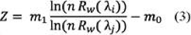 Se aplicó el modelo empírico de (Stumpf et al. 2003), (Ecuación 3). Este algoritmo utiliza la transformación del cociente entre la banda azul y verde la cual determina la batimetría relativa del fondo marino; este procedimiento permite estimarla eficientemente en aguas poco profundas de zonas costeras (Jagalingam et al. 2015). Se determinó las variables m1 y m0 por medio de una regresión lineal con los puntos de profundidad (n =100).