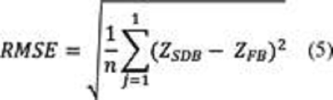 Se crearon 100 puntos aleatorios distribuidos homogéneamente sobre la SDB para contar con el mismo número de puntos en el análisis de precisión, se extrajo el valor de profundidad sobre el resultado SDB, se procedió a realizar la comparación de las profundidades observadas (in situ) vs. las estimadas por el modelo (SDB); se determinó el Error Medio Cuadrático (RMSE), Error Medio Absoluto (MAE) y el coeficiente de determinación de ajuste (R2) como parámetros estadísticos de evaluación, se utilizó las ecuaciones expuestas en (Tang & Mahmud, 2018) (Ecuación 4 y 5); según (Gao, 2009) estos parámetros de evaluación se utilizan como una medida de precisión de la SDB estimada con imágenes ópticas; se realizó una gráfico donde se comparó los valores observados vs. estimados; adicionalmente, se realizó un perfil de la sección central, que determina la incertidumbre del modelo SDB frente a la profundidad real y la distancia en metros aguas adentro.