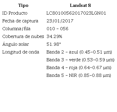 Se utilizó una imagen multiespectral del satélite Landsat 8, sensor OLI (Operational Land Imager) del 23 de enero de 2017 con resolución espacial de 30 m en bandas utilizadas (Azul, Verde y NIR), fue obtenida del centro de descarga de imágenes Landsat del Servicio Geológico de los Estados Unidos, a través de la plataforma web https://earthexplorer.usgs.gov/ (USGS, 2017) (Cuadro 1). Según Tang & Mahmud, (2018) las bandas que generalmente se utilizan para el mapeo batimétrico están por el rango espectral de (0.45 - 0.52 µm) y (0.53 - 0.59 µm) correspondiente a la longitud de onda de la banda azul y verde del Landsat 8.