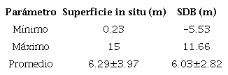 Se obtuvo dos superficies batimétricas a resolución de 30 m para los datos in situ y SDB, se encontró que el área de estudio morfológicamente presentó un fondo marino prolongado a través de terrazas marinas; de igual manera, la superficie SDB evidenció una profundidad promedio de 6.03 m, el valor mínimo de SDB correspondió a -5.53 m (Cuadro 2) este valor negativo correspondió a zonas con procesos de acreción.