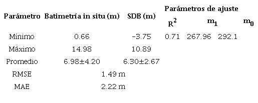 Dentro de la comparación de las superficies batimétricas derivadas, se evidenció que la SDB obtuvo un promedio de profundidad de 6.30 m (Cuadro 3); la muestra de puntos (n=100) fue acorde y no presentó saturación en la regresión lineal que alcanza un R2 de 0.71; el ajuste del modelo determinó los parámetros de ajuste m1 y m0; el valor del RMSE y MAE fue de 1.49 y 2.22 m respectivamente.
