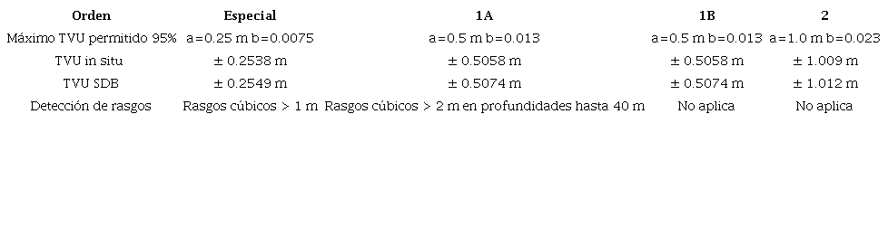 Se determinó el valor de incertidumbre máxima TVU permitida en ambas superficies (Cuadro 4); se observó que los valores de TVU para la SDB son ligeramente mayores a los de la batimetría in situ para las diferentes categorías del estándar S-44 en la detección de rasgos.