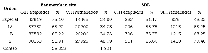 De igual manera, los puntos de profundidad que cumplen la categoría de Orden Espacial corresponden el 75.10 y 51.17% para datos in situ y la SDB respectivamente (Cuadro 5); el valor de rechazo más alto de TVU correspondió para el Orden 2 de la SDB con el 73.40%.