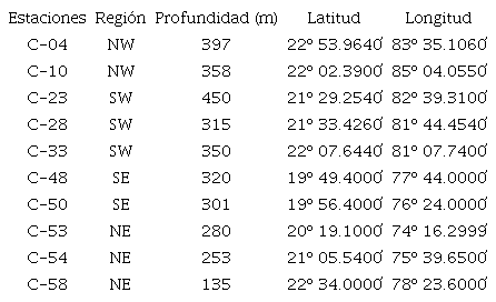 La expedición científica conjunta Cuba-Estados Unidos fue realizada entre el 15 de mayo y 11 de junio de 2017, donde se muestrearon 10 sitios de arrecifes mesofóticos de Cuba (Cuadro 1). Las muestras para los análisis microbiológicos se colectaron en frascos de vidrio estériles de 250 mL de capacidad y se tomaron de la capa subsuperficial (5 m) y de las aguas de las máximas profundidades (135-450 m); utilizando una roseta con botellas oceanográficas Niskin de 10 L de capacidad.