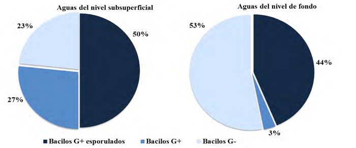 A partir de las características culturales se obtuvieron 62 aislados de bacterias heterótrofas, 30 pertenecen a las aguas del nivel subsuperficial y 32 a las aguas profundas de los sitios de arrecifes mesofóticos de Cuba. La caracterización microscópica de los cultivos evidenció que el 50% de los aislados del nivel subsuperficial pertenecían al grupo de los bacilos G+ esporulados y en menor proporción los bacilos Gram positivos asporógenos (27.0%) y los bacilos G- (23.0%). En las aguas del nivel de fondo predominaron los bacilos G- (53.0%), seguido de los bacilos esporulados G+ (44.0%) y en un porcentaje bajo los bacilos G+ asporógenos (Fig. 1).