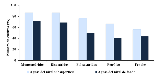 En general, un alto porcentaje de los aislamientos fueron capaces de emplear indistintamente monosacáridos (79.0%), disacáridos (77.4%), polisacáridos (62.9%), petróleo (53.2%) y fenoles (50.0%) como única fuente de carbono y energía. Asimismo, se evidenció que el porcentaje de cepas degradadoras varió en función de la complejidad y accesibilidad del compuesto, independiente de los niveles de la columna de agua, aunque para el nivel subsuperficial el porcentaje de cultivos degradadores fue mayor que para el nivel de fondo (Fig. 2).