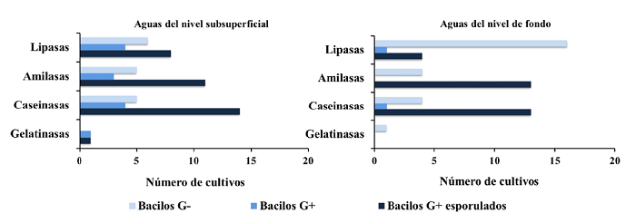 resultó notable la baja incidencia de cultivos que hidrolizan la gelatina con respecto al resto de los sustratos (Fig. 3). Los bacilos G+ esporulados y los bacilos G- fueron los que presentaron mayor actividad hidrolítica en ambos niveles, mientras para las aguas del nivel de fondo se detectó un mayor porcentaje de cultivos del grupo de los G- con actividad lipolítica (Fig. 3).
