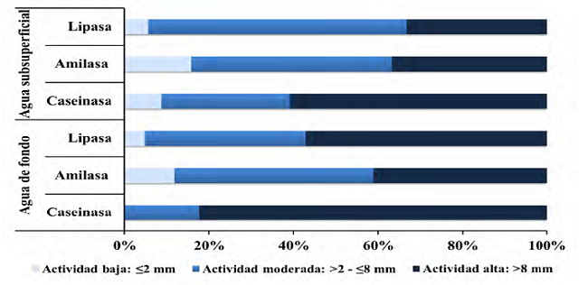 A partir de la determinación semicuantitativa de la producción de las enzimas caseinasa, amilasa y lipasa se estableció la clasificación de los cultivos positivos según Ong et al. (2011). En particular, se demostró que 46 cultivos presentaron alta actividad enzimática para al menos una de las enzimas hidrolíticas evaluadas, con la formación de halos de hidrolisis >8mm. Asimismo, se detectó que predominó una alta (>8 mm) y moderada (>2; ≤8 mm) actividad enzimática en las aguas de ambos niveles, independientemente de la complejidad de los sustratos (Fig. 4). Es de destacar los elevados porcentajes de cultivos del nivel de fondo con alta actividad caseinasa y lipasa (>8 mm) con respecto a los del nivel subsuperficial (Fig. 4).
