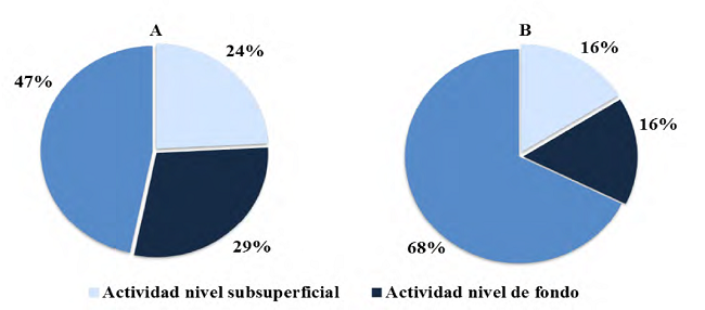 Del total de aislados un alto porcentaje produjeron sustancias con actividad superficial (53.2%, 33/62) (Fig. 5A). Los resultados demostraron una distribución similar en el porcentaje de cultivos productores tensioactivos procedentes tanto de las aguas del nivel de fondo (29.0%) como del nivel subsuperficial (24.2%); con valores ≤35.0 mN/m con respecto al control (50.3 mN/m) (Fig. 5A). Debe destacarse que el 27.3% (9/33) producen compuestos que disminuyen la tensión superficial a valores ≤30 mN/m. Asimismo, se encontró que el 60.6% de los cultivos (20/33) que produjeron compuestos tensioactivos presentan actividad lipolítica; mientras el 24.2% (8/33) presentaron además, la capacidad para degradar los hidrocarburos del petróleo.