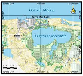 La laguna Mecoacán se localiza al noreste de la llanura deltáica del río Mezcalapa, comunicada con el golfo de México a través del canal “barra de Dos Bocas”. Tiene un área aproximada de 5168 ha. El 95.5% de la superficie del estado de Tabasco presenta clima cálido húmedo, la temperatura media anual en la entidad es de 27°C, la precipitación media estatal es de 2 550 mm anuales (INEGI, 2019). Es una laguna costera somera con una profundidad que varía entre 0.9 y 2.3 m y está conectada con los ríos Escarbado y González por la porción este, el río Cuxcuchapa por el sureste y el río Seco por el noroeste y con el mar por medio de la barra Dos Bocas (Domínguez et al. 2003). Se integra al complejo fluvio-deltáico, conformado por los ríos más caudalosos de México: el Grijalva y el Usumacinta (Contreras-Espinoza, 1993). El comportamiento estuarino de la laguna está definido por la pauta de mareas, por los aportes de agua dulce y por el régimen de lluvias (George-Zamora & Aldana-Aranda, 2000).