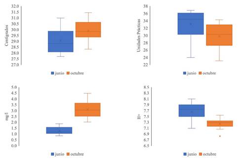 El análisis de las variables ambientales que compara las campañas de junio y octubre mostró diferencias significativas en salinidad, oxígeno disuelto y pH, lo cual se explica por la temporalidad climática de la zona. En cuanto a la temperatura no se identificaron diferencias estadísticas significativas.