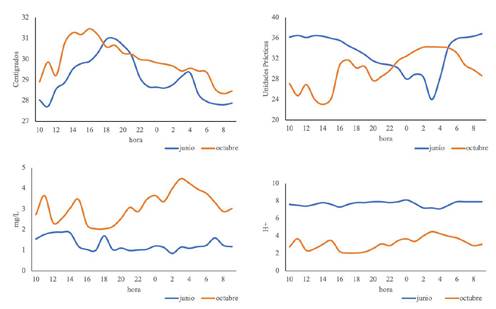 Bajo este marco climático las observaciones de las variables ambientales medidas en el agua del sitio de muestreo se consideran consecuentes y con un comportamiento nictemeral estadístico normal y, además, con diferencias significativas en cuanto a la salinidad, el oxígeno disuelto y el pH entre los dos de muestreo. En este sentido, además del marco climático, la variabilidad nictemeral y la condición de la marea son evidencias determinantes en los resultados, lo cual coincide con lo que refiere Domínguez et al. (2011). También, Ayala-Pérez et al. (2014) describen los procesos costeros que están relacionados con el comportamiento ambiental como las mareas, las corrientes litorales, el volumen de descarga de los ríos, la dirección e intensidad de los vientos, la producción primaria y la oxidación de la materia orgánica, principalmente.