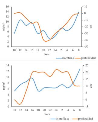 Los resultados que comparan la concentración de la clorofila a con la profundidad del sitio de muestreo esquematizan las distintas condiciones que la marea provocó en las dos campañas de muestreo. Por una parte, en junio, se aprecia una sincronía entre la concentración de la clorofila y la profundidad, sin embargo, en octubre se observa un proceso inverso; es decir, mientras la profundidad aumenta la concentración de clorofila disminuye.