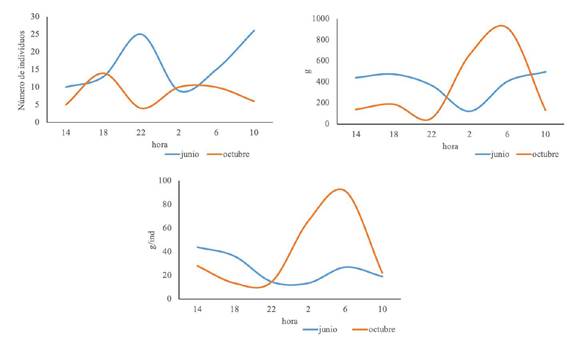 En la figura 5 se muestra el comportamiento de la abundancia en las dos campañas de muestreo. En junio el mayor número de individuos se observó a las 10:00 horas con 26 y el más bajo fue a las 02:00 horas con 9 individuos; en octubre se registraron 14 individuos a las 18:00 horas y 4 a las 22:00 horas. En cuanto a peso, en junio se registraron 496 g a las 10:00 horas y 121 g a las 02:00 horas, en contraste, en octubre se registraron 914 g a las 06:00 horas y 57 g a las 22:00 horas. En junio el mayor peso promedio fue de 44 g/ind. registrado a las 14:00 horas y el menor de 13 g/ind. a las 02:00 horas; en oposición, en octubre el mayor peso promedio se registró a las 6:00 horas con 91 g/ind. y el menor se presentó a las 18:00 horas con 13 g/ind.