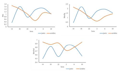 En cuanto a los indicadores de diversidad, en la figura 6 se muestra el comportamiento nictemeral de la heterogeneidad, equidad y riqueza de especies. El intervalo de variación de la heterogeneidad en la campaña de junio fue de 0.348 bits que se registró a las 14:00 horas y 1.61 bits a las 18:00 horas, en tanto que en octubre el valor más bajo fue de 0.50 bits a las 02:00 horas y el máximo de 1.69 bits a las 14:00 horas. Para la equidad, en junio, los valores oscilaron entre 0.50 bits/ind. A las 14:00 horas y 0.84 bits/ ind. a las 02:00 horas, y para octubre el valor mínimo fue de 0.72 bits/ind. registrado a las 02:00 horas y el valor máximo fue de 0.95 bits/ind. A las 10:00 y 14:00 horas. Para la riqueza de especies en la campaña de junio, el indicador presentó valores entre 0.45 bits/sp a las 14:00 horas y 2.21 bits/sp a las 18:00 horas, mientras en octubre el valor más bajo fue de 0.62 bits/sp a las 02:00 horas y el más alto de 2.17 bits/sp a las 14:00 horas.