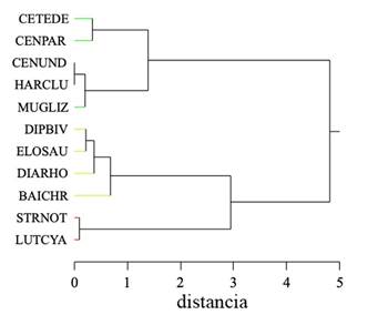 En la figura 7 se presenta el resultado del análisis clúster para las once especies dominantes. Con una distancia de corte de dos, se identifican tres asociaciones. El primer grupo está integrado por Cetengraulis edentulus, Centropomus parallelus, Centropomus undecimalis, Harengula clupeola y Mugil liza. En el segundo grupo se distingue a Diplectrum bivittatum, Elops saurus, Diapterus rhombeus y Bairdiella chrysoura y, finalmente, el tercer grupo está integrado por Strongylura notata y Lutjanus cyanopterus.