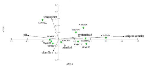 El análisis de correspondencia canónica destacó la relación de la salinidad, el oxígeno disuelto y la profundidad (condicionada por la marea) sobre la mayor parte de las especies dominantes, además de que la productividad primaria (concentración de clorofila a) tiene una asociación débil con la presencia de las especies.