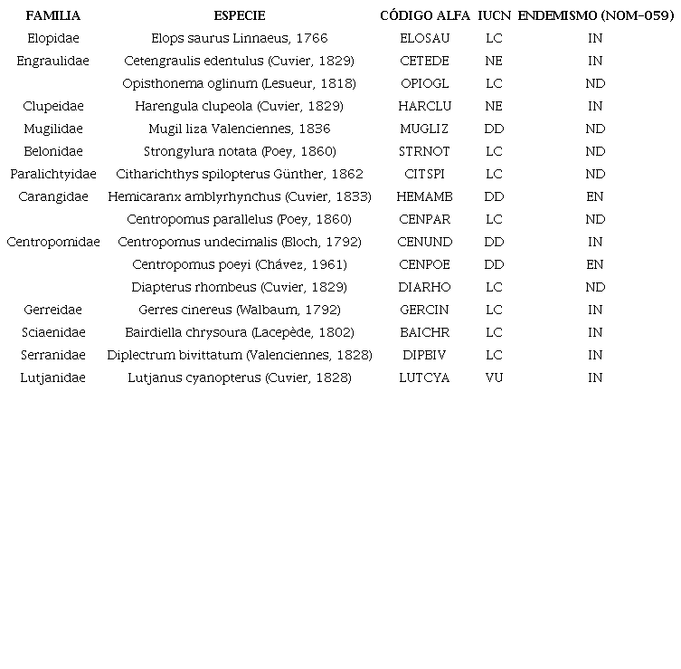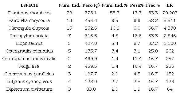 Se capturó un total de 16 especies de peces de entre las cuales se identificaron 11 con dominio ecológico. La selectividad del arte de pesca condiciona el tamaño de la muestra; sin embargo, es evidente que la diversidad de la comunidad nectónica es más grande. Dentro de las especies dominantes se identifican recursos pesqueros de alto valor económico como los robalos, los pargos y la lisa.