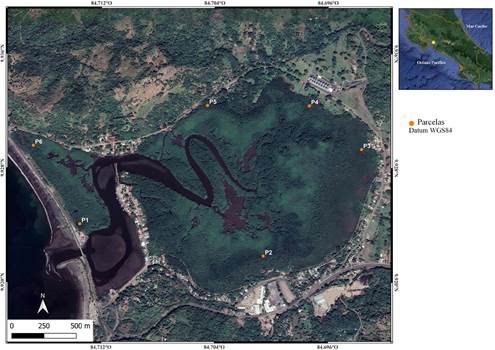 y una de 10x10 m (# 6) (Fig. 1). En cada una de ellas se determinó el número de árboles de manglar vivos o muertos, se identificó la especie y se cuantificó la altura mediante una estimación visual aproximada de la parte más alta de la copa, debido a que la densidad del dosel impedía el uso del clinómetro. Además, el DAP se midió únicamente a los individuos que presentaron un diámetro mayor a 2.5 cm a un nivel de 1.3 m desde el suelo; en el caso del género Rhizophora la medición se realizó sobre la raíz más alta.