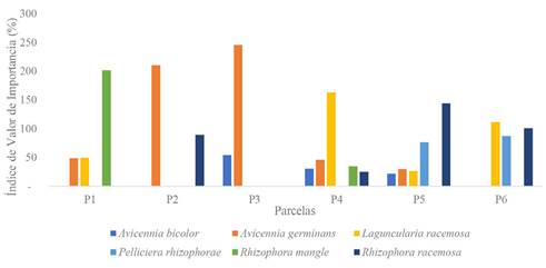 En general, la especie con mayor índice de importancia fue A. germinans, presente en cinco de las seis parcelas establecidas en el manglar. Por su parte, Rhizophora mangle fue la más importante para el sitio uno; L. racemosa tuvo una alta presencia en el cuatro y seis, y para el área cinco la más relevante fue Rhizophora racemosa(Fig. 2).