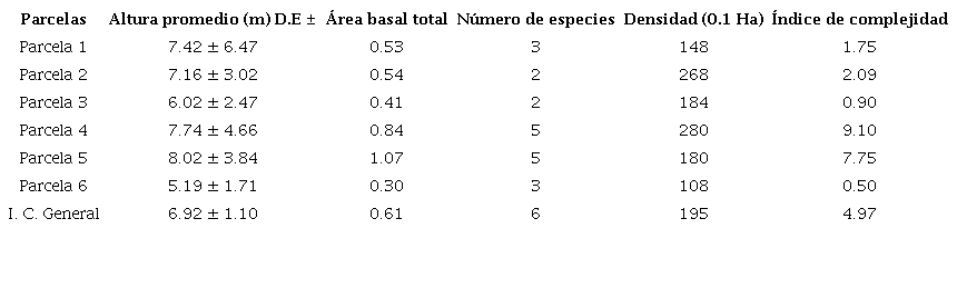 La mayor complejidad estructural la presentó la parcela cuatro (9.1), seguida por la cinco (7.4); en ambas hubo presencia de cinco de las seis especies identificadas; además, presentaron los valores de altura y área basal más altos encontrados en el manglar; en comparación, la seis presentó la menor complejidad (Cuadro 1).