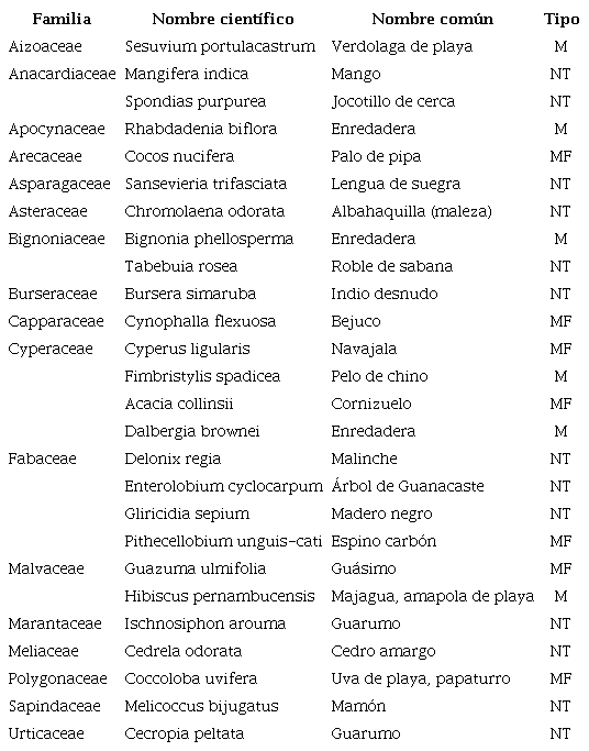 A la Estación de Biología Marina Juan Bertoglia Richards de la Universidad Nacional por las facilidades concedidas para realizar el trabajo de campo y la identificación de las muestras de flora, en especial a Marvin Ramírez. A Jesús Alfaro, Ariel Azofeifa, Mónica Espinoza y Laura Sotela por el apoyo brindado en la toma de datos y análisis de las muestras. Un agradecimiento especial a Alexandre Tisseaux. A los tres revisores anónimos por sus aportes para la mejora de este trabajo.