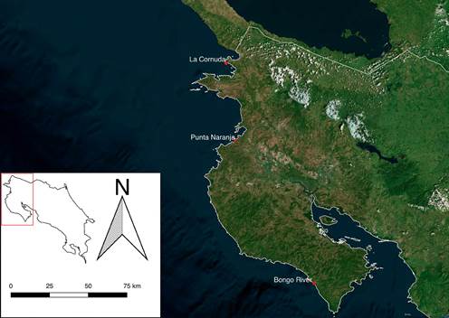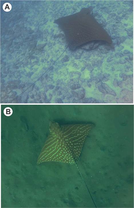 Sightings of A. asperrimus were video recorded during apnea dive surveys in the Gulf of Santa Elena, specifically at “La Cornuda” (11° 33’ N, 85° 41’ W) in April 2015 and December 2017, and in the Gulf of Papagayo, specifically at “Punta Naranja” (10° 33’ N, 85° 41’ W) in September 2019, both sites located in the northern Nicoya Peninsula (Fig. 1). Additional specimens were opportunistically caught during bull shark (Carcharhinus leucas) fisheries independent surveys in front of the mouth of the Bongo River (9° 44’ N, 85° 14’ W), in the Marine Protected Area of the Caletas-Arío National Wildlife Refuge (NWR) (Fig. 1), Southern Nicoya Peninsula, between March 2017 and August 2019. The fishing gear was rigged to catch bull sharks and consisted of a 250-300 m mainline built with 4 mm braided nylon rope, set at the bottom at ~ 8-12 m depth. Every 6 to 8 m a gangion with a hook was clipped to the mother line. Gangions consisted of 1 m of monofilament line (2 mm) and a 45 cm extension of stainless-steel wire leader, to which circle hooks (no.14 and 15, 10°offset) were attached. Hooks were baited with frozen sardine (Clupeidae) and skipjack tuna (Katsuwonus pelamis Linnaeus, 1758). Rough eagle ray specimens caught were measured