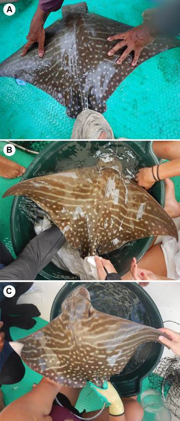 Seven rough eagle rays were reported along the North Pacific coast of Costa Rica, from April 2015 to August 2019 (Table 1). Three individuals were observed during apnea diving activities in coastal waters of the Gulfs of Santa Elena and Papagayo in April 2015, December 2017, and July 2019. The individuals were observed actively swimming about 5 8 m above a sandy and coarse sandy-gravel bottom (Fig. 2). Four additional individuals, two females and two males, were caught and released at the mouth of the Bongo River (Fig. 3). The specimens caught measured between 69-150 cm of DW (Table 1). The morphological identification of the specimens was evident by inspecting the disk from a dorsal view, with its distinctive brownish to greyish coloration, including the distinctive 7-9 white band pattern on the front end of the disk, and numerous white spots, mostly in the back end of the disk (Fig. 2 and 3).