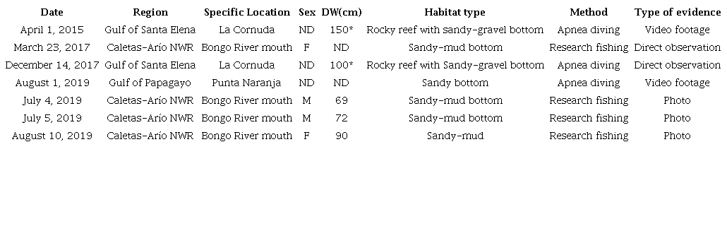 The presence of the species had been reported in taxonomic checklists from Mexico (Castro-Aguirre & Espinosa-Pérez, 1996; Eheman et al. 2018), Panama (McEachran & Notarbartol di Sciara, 1995), and Galapagos ( Grove & Lavenberg, 1997). Consequently, it was expected to occur from Mexican waters to northern Peru (Castro-Aguirre & Espinosa-Pérez, 1996; Bussing & López, 2009; Espinoza et al. 2018; Robertson & Allen, 2015; Weigmann, 2016; Eheman et al. 2018). However, Panama is the only country where a specimen had been actually described (type specimen: female, 79 cm disc width). Our observations represent the first records for this species in Costa Rica.