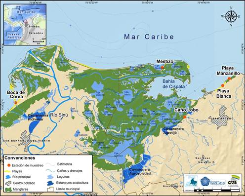 Este estudio fue cofinanciado por el INVEMAR y la Corporación Autónoma Regional de los Valles del Sinú y San Jorge (CVS) en el marco de la Red de Vigilancia para la Conservación y Protección de las Aguas Marinas y Costeras de Colombia REDCAM. Se agradece el apoyo del personal técnico de INVEMAR en las actividades de campo, análisis de laboratorio y en la cartografía; y a los revisores anónimos que ayudaron a mejorar este manuscrito. Contribución científica del INVEMAR No. 1346.